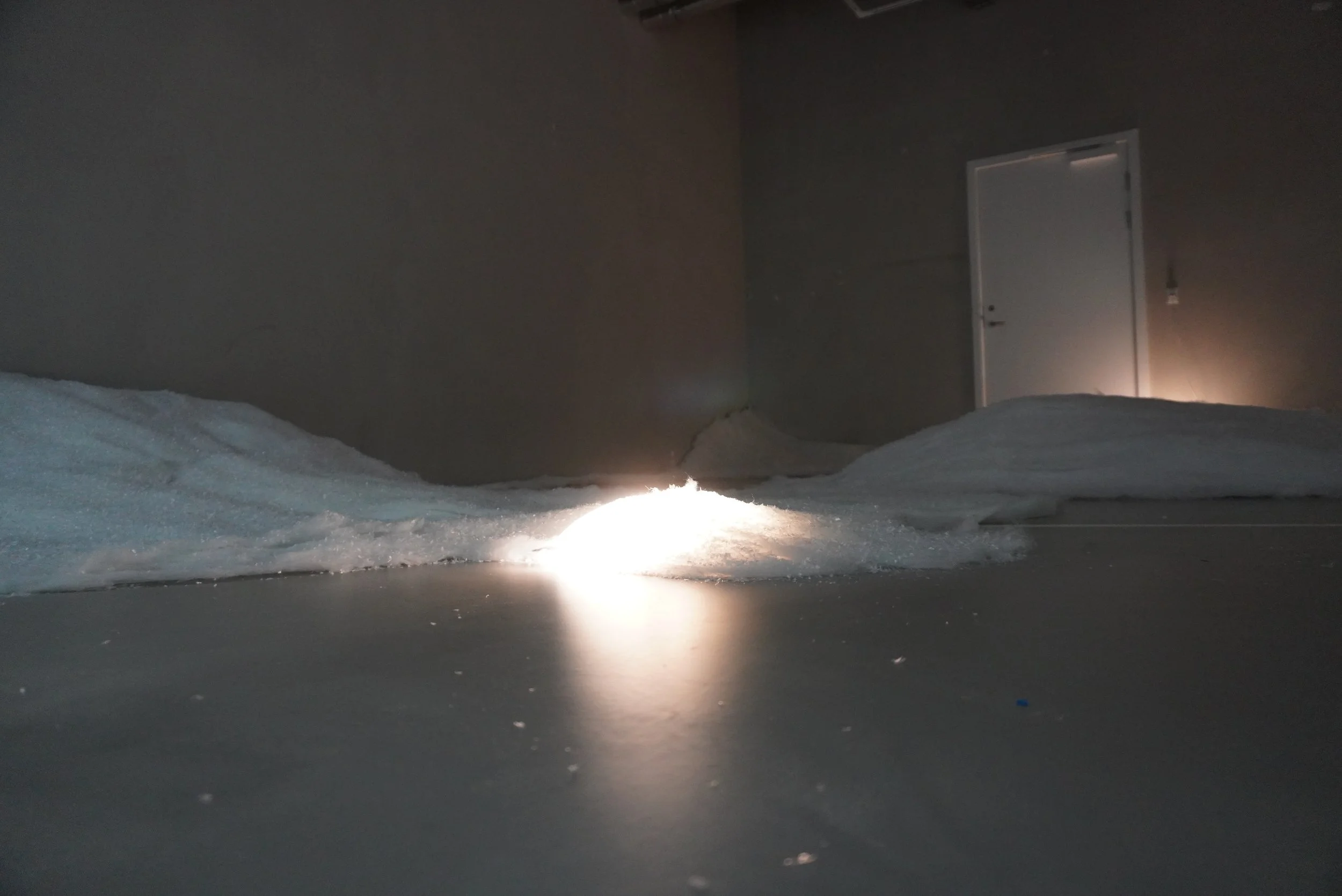 November er efterår. For mange af os har ordet en poetisk men også trist klang. Efter-år, som når noget er slut, selvom året endnu ikke er det. Det indvarsler vinteren, der på gotisk betyder Den Våde Årstid. Netop denne vinter kan man opleve billedkunstner Rasmus Myrups installation “Fimbul” i et råt butikslokale på 1. sal i Amager Centret. Mellem Pakkeshop og Bahne inviterer et indespærret snelandskab til refleksion omkring det cykliske i både årstider og relationer såvel som forholdet mellem mennesket og naturen.